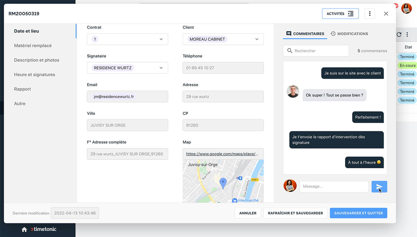 Your technicians can write their intervention reports and send any necessary information (photos or other files) to the right person in real time, thus saving your team leaders costly trips.